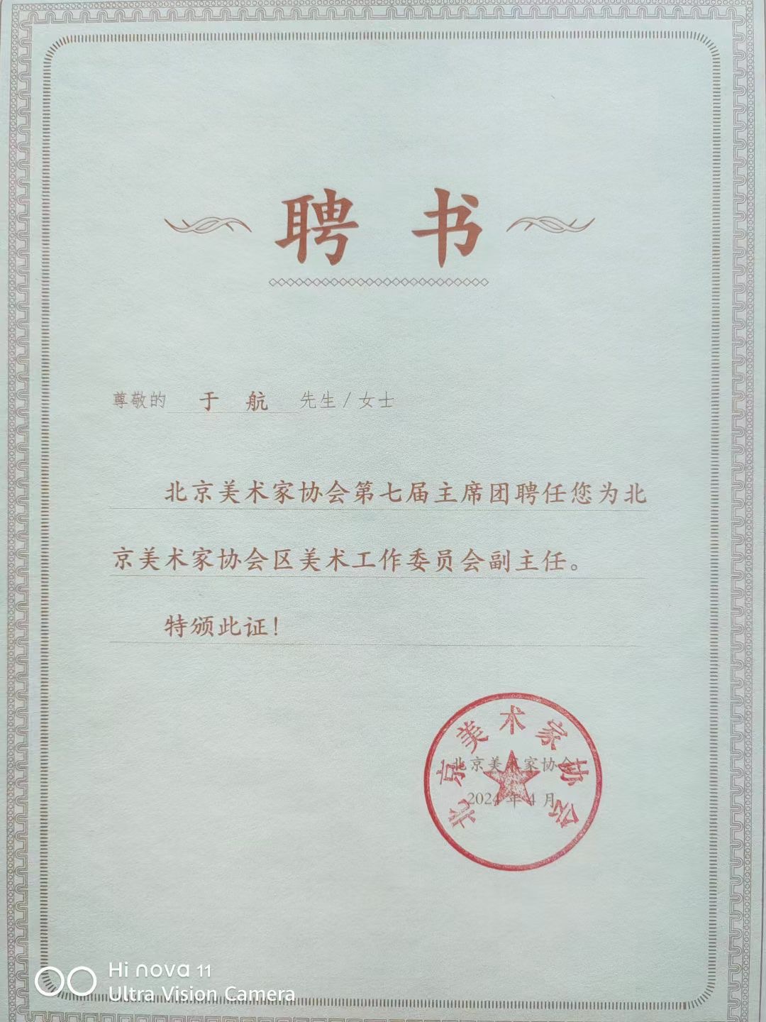 北京美术家协会第七届主席团聘任昌平区美协主席于航同志为区美术工作委员会副主任。